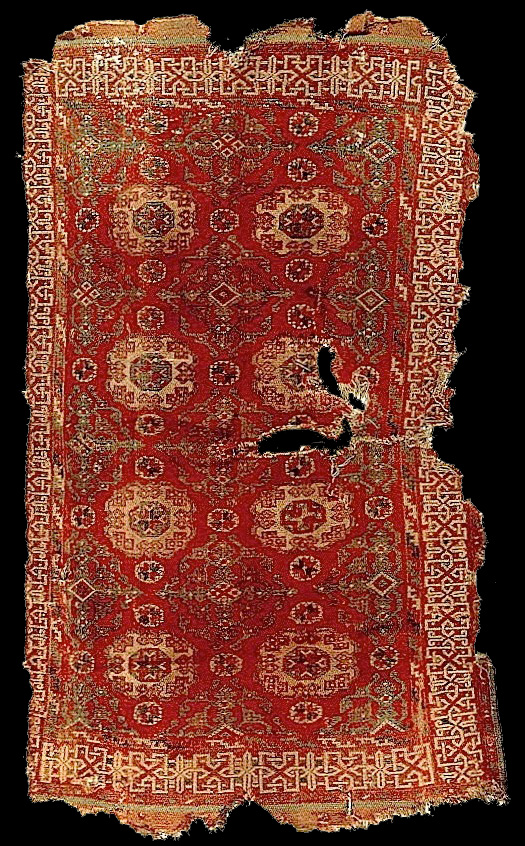Small-pattern Holbein rug, west Anatolia, mid-16th century. 1.21 x 1.98m (4'0" x 6'6"). Germanisches Nationalmuseum, Nuremberg, Gew 4909. The rug was taken from Transylvania to Germany late in World War II by the Saxon parishioners of the Lutheran Church in Bistrita (Bistritz), Romania. |