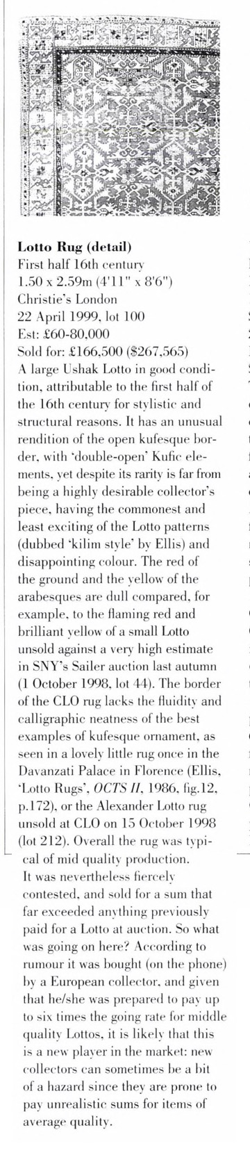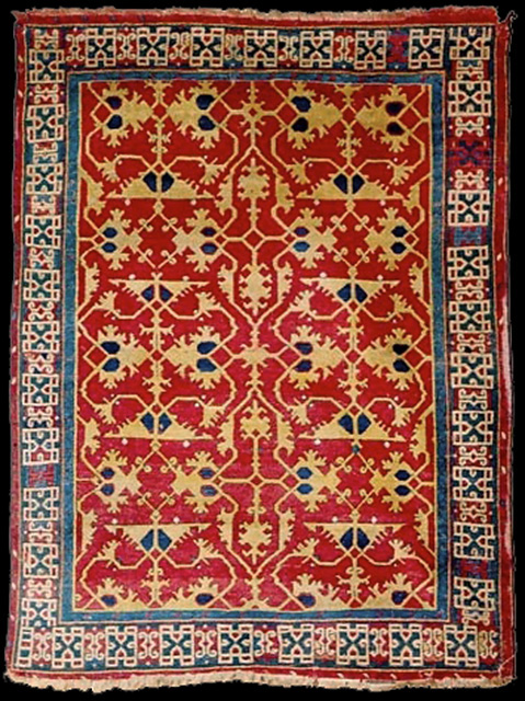 "Lotto" rug, XVI century, Western Turkey, Ushak Region, Ottoman Empire. Sotheby's 29 March 1978, Lot 91 (£11 000). Published in Hali Magazine