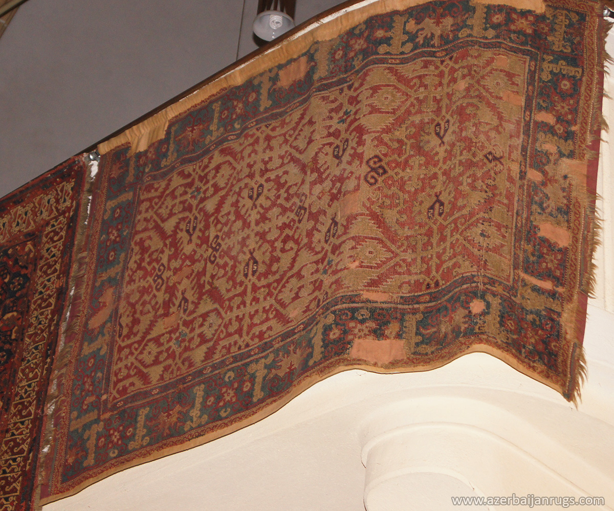 "Lotto" rug with ragged-palmette and hooked bar motif main border, 1600s. Western Turkey, Ushak Region, Ottoman Empire. St Margaret''s Church, Medias (Mediasch) {Biserica Fortificata Din Medias} |