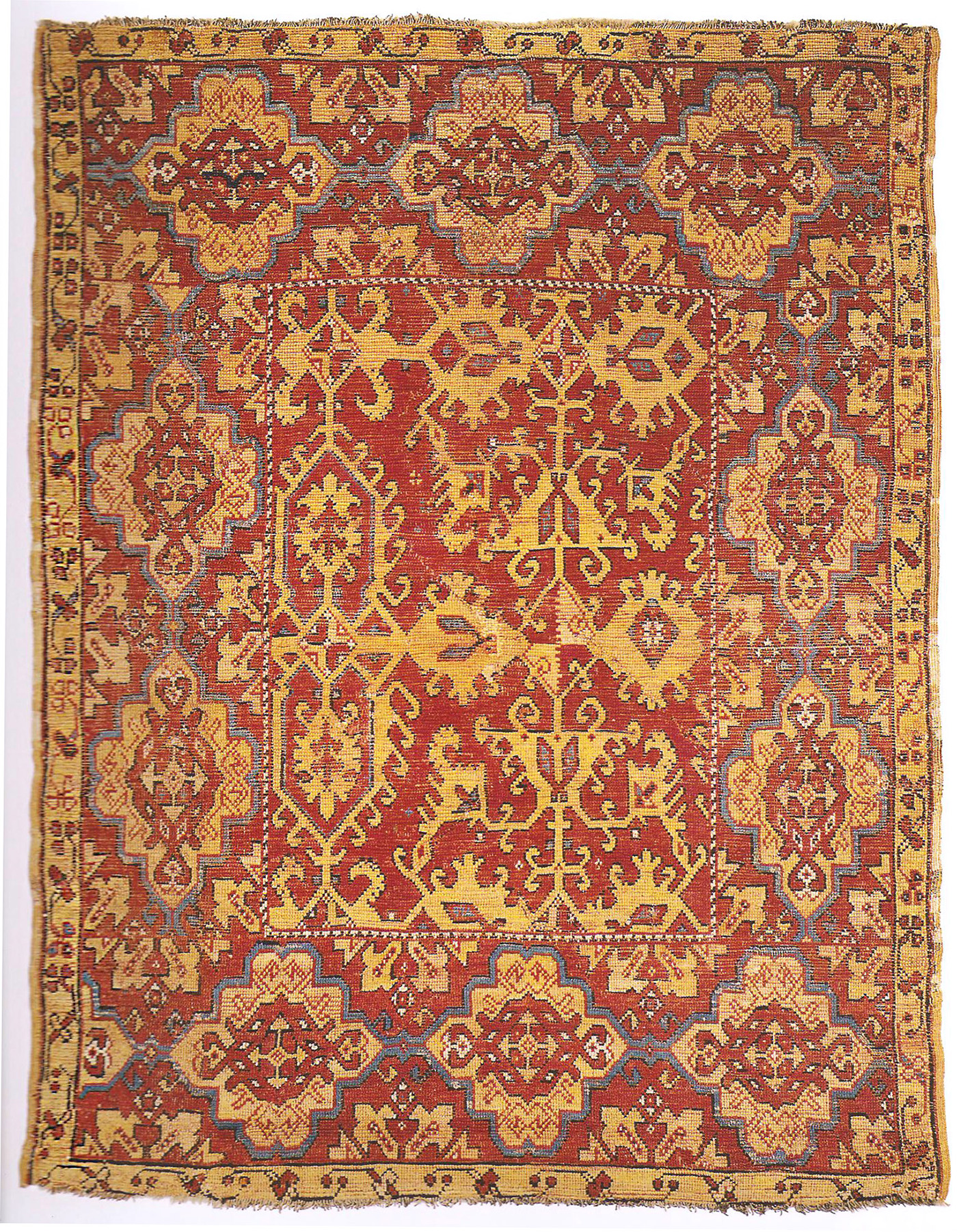 "Lotto" rug, 2nd half 17 century, Western Turkey, Ushak Region, Ottoman Empire. 115x148cm, 830 knots/dm2. "Ornamented" style. One of the very few rugs from Schmutzler's collection still preserved in Romania, it was later sold to George Oprescu who donated it to the Romanian Academy. Museum of Art Collections, Bucharest, inv.260/16