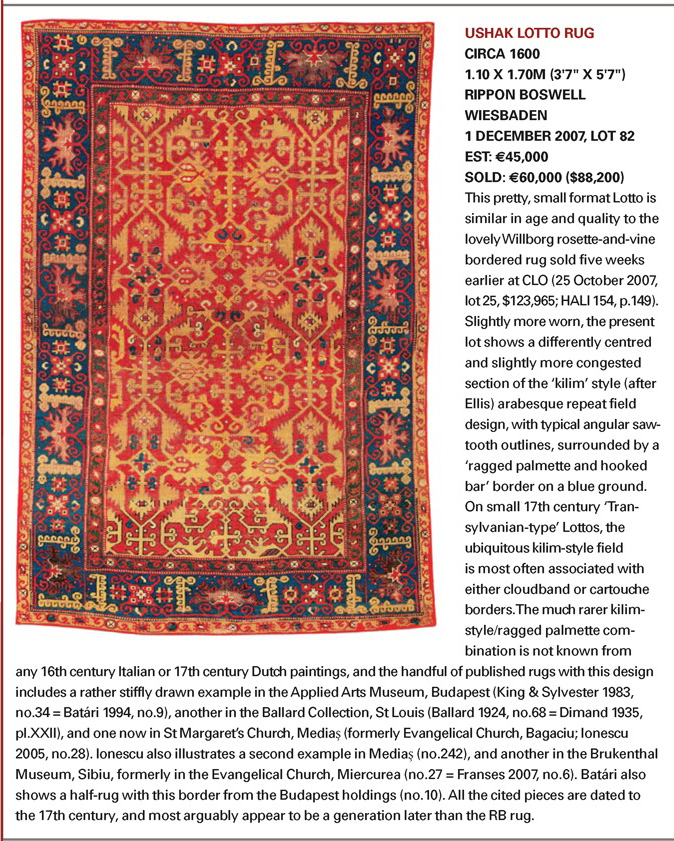 "Lotto" carpet in a "kilim" style, second half 16th century, Western Turkey, Ushak Region, Ottoman Empire. Major Autumn Auction, 01. December 2007. Rippon Boswell & Co. International Auctioneers of Rare Carpets & Textiles. Sold for 60 000 euros. 110x170cm.