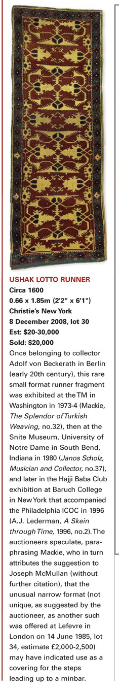 Christie's Sale 2060Oriental Rugs and Carpets8 December 2008, New YorkPrice realised USD 20,000reduced in length approximately 6 ft. 1 in. x 2 ft. 2 in. (185 cm. x 66 cm.)