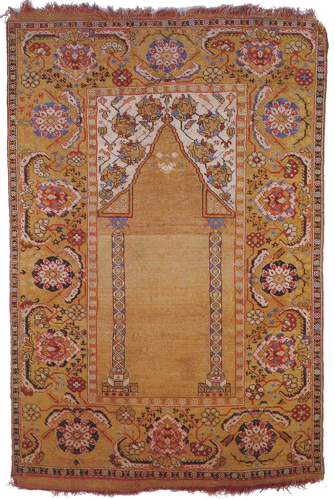 Western Anatolian Turkish prayer rug in a yellow ground, "Transylvanian" type with two columns, late XVII century. Hungarian National Museum, Budapest, inv. no: 1914.94.7