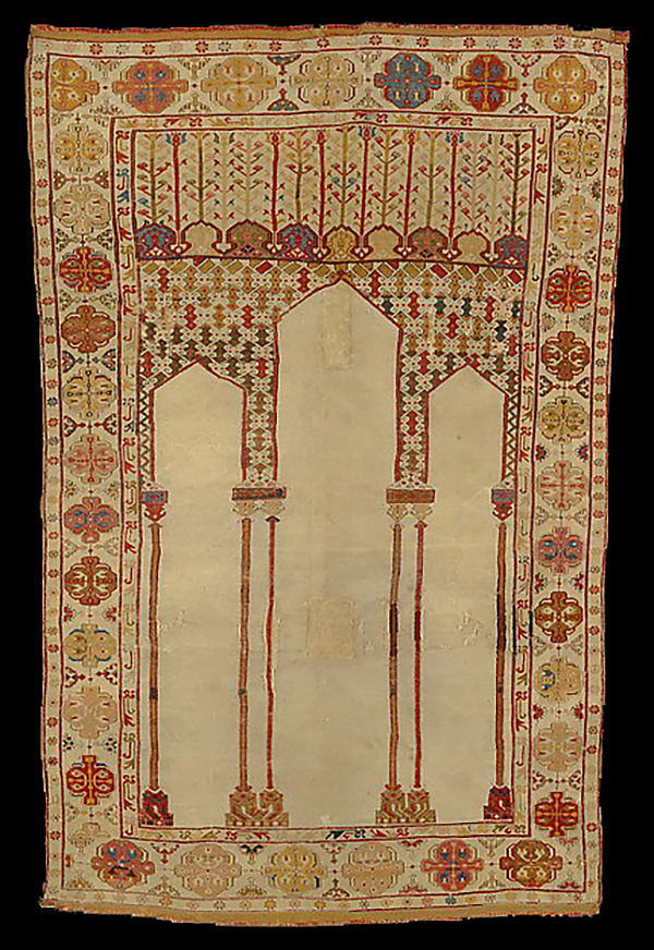 Western Anatolian Turkish prayer rug with a triple arched design , "Transylvanian type", circa ~1700, (dated to 19th century by the museum). McMullan Collection, currently The Metropolitan Museum of Art, New York. Accession Number: 1974.149.19
