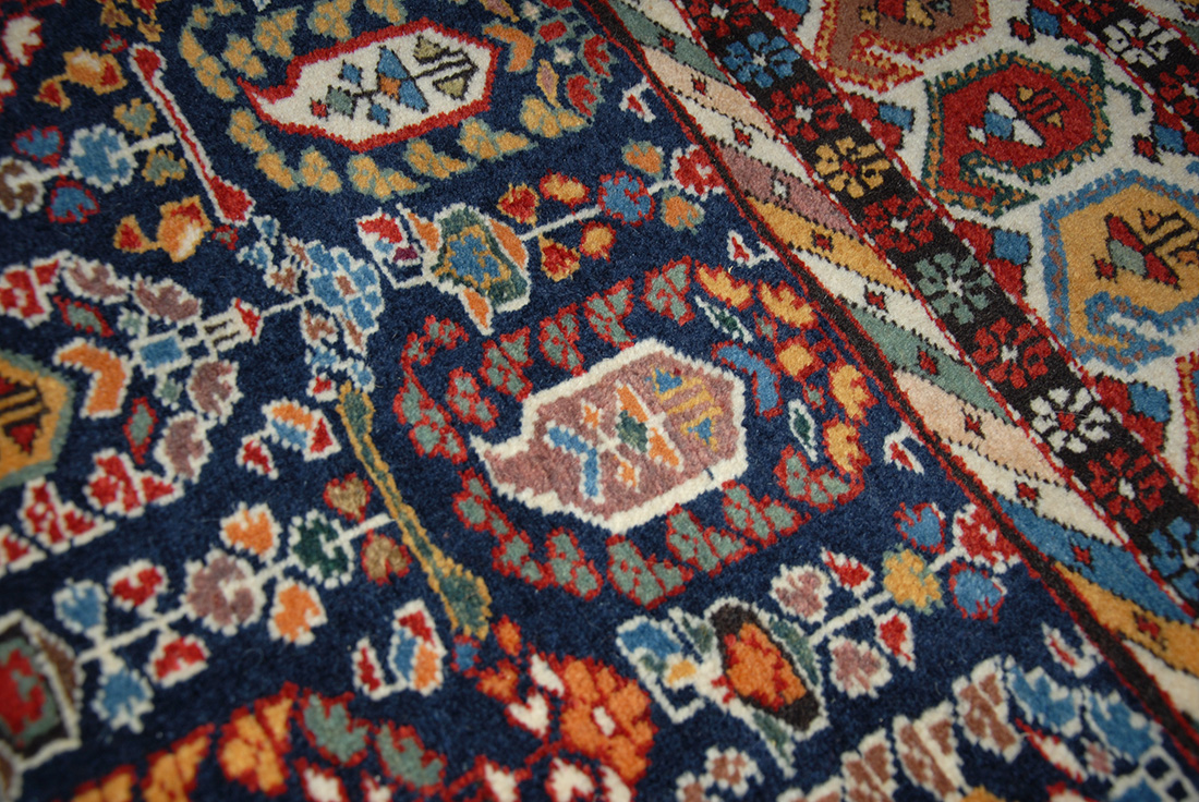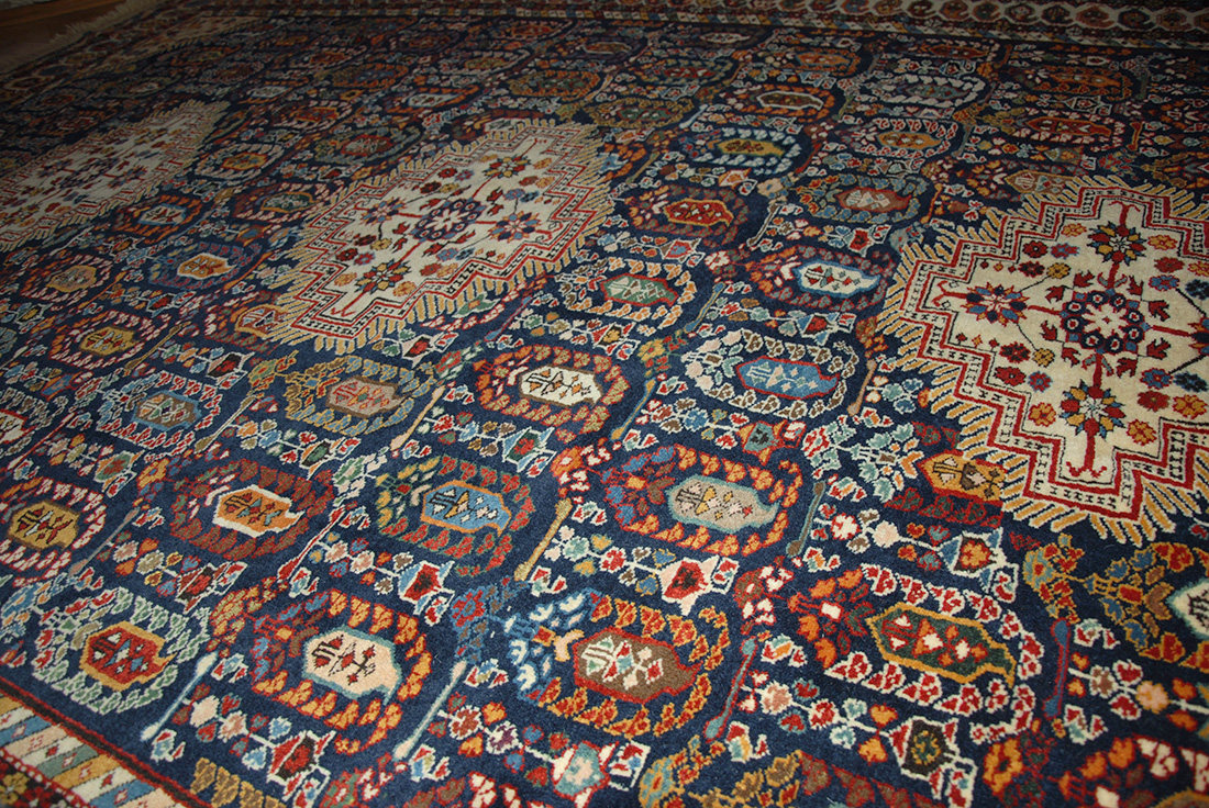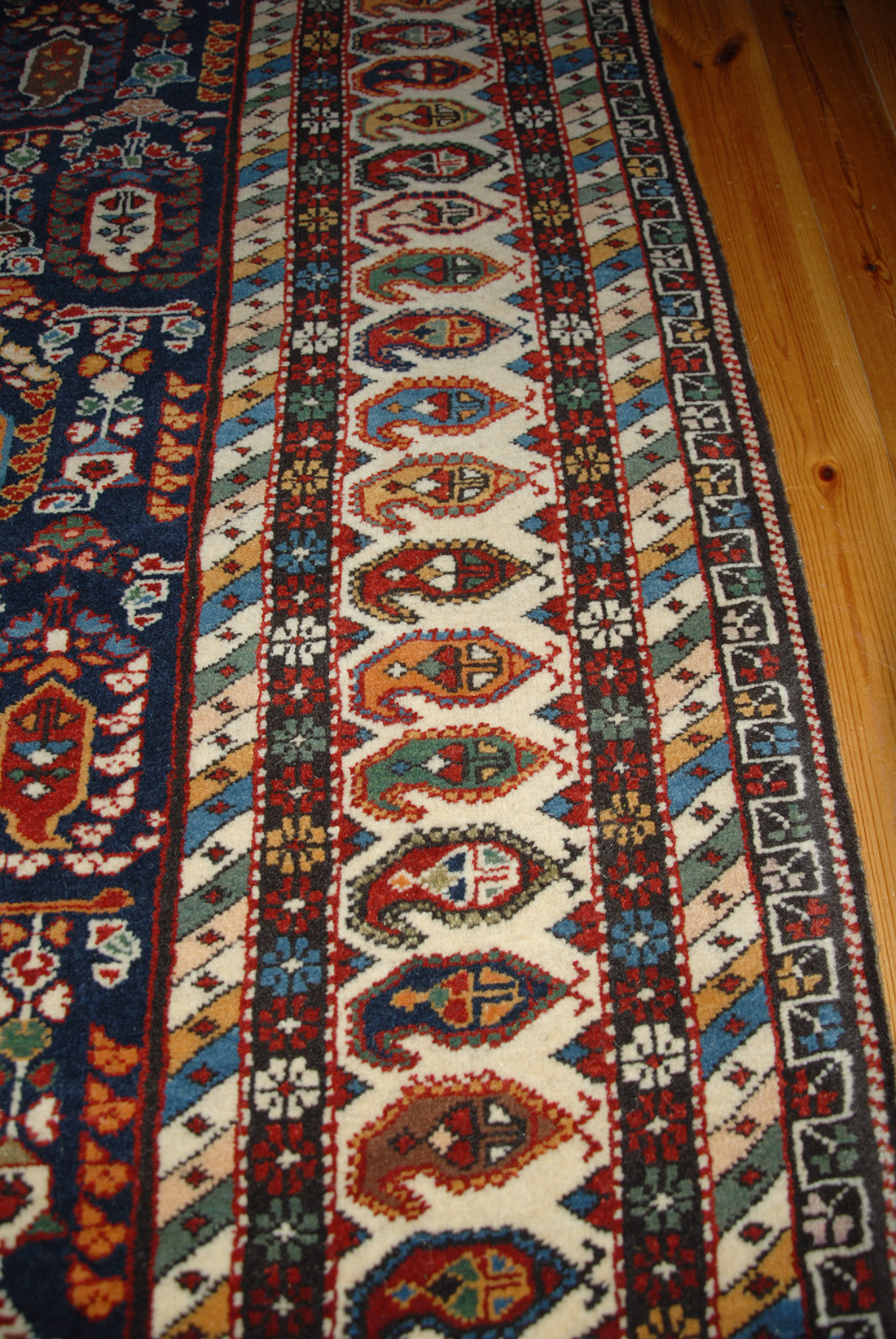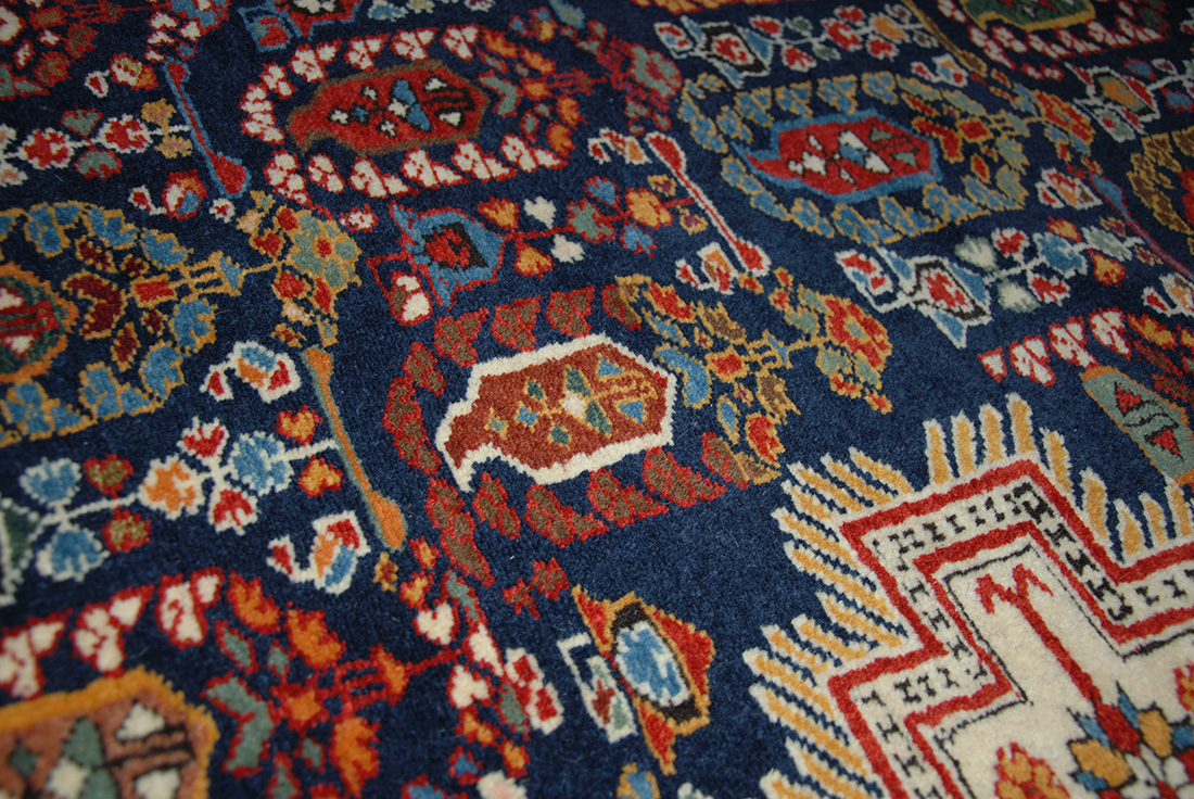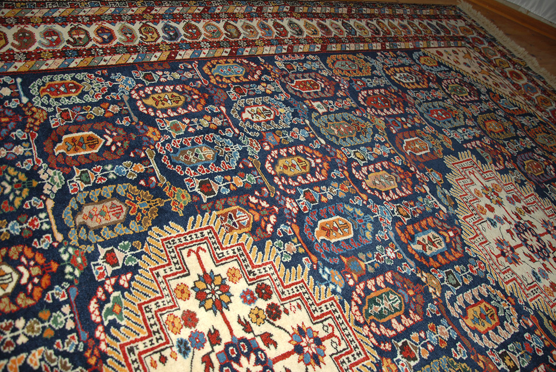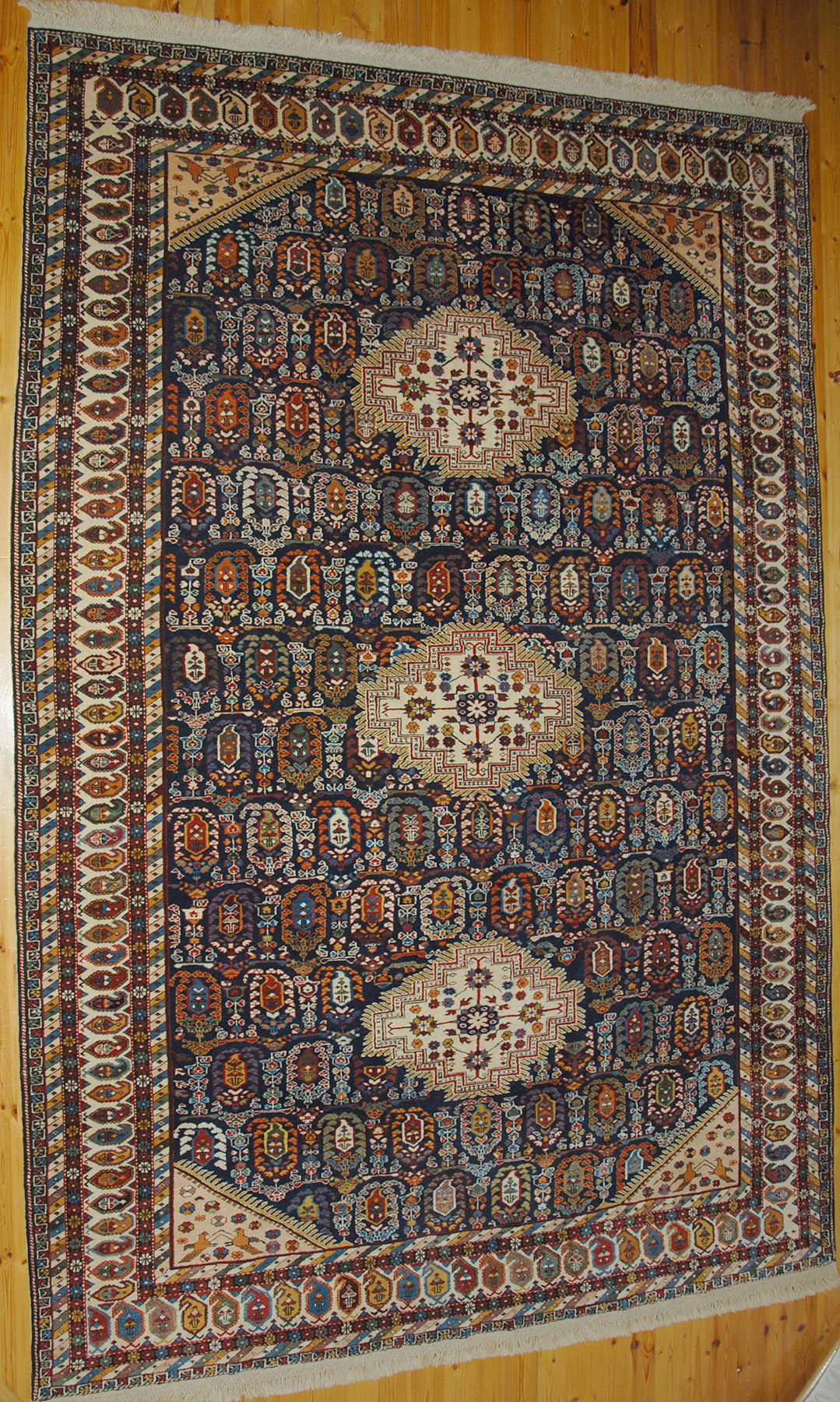 rug Code: BKXB03 Size: 224x338cm Size (ft): 7'4"x11'1" Area: 7.57 m2 Density: 170 000 knots per square meter, totally ~1 200 000 knots Colors: midnight blue, medium blue, cinnamon, apricot, purple, medium light blue, red, yellow, green, maroon, dark green, light green, hazelnut, aubergine, dark brown, dark goldenrod, medium brown, ivory. Dyes: madder, weld (Reseda Luteola), onion skins, indigo, pomegranate skins, walnut husks, natural dark brown sheep wool, natural ivory sheep wool. Materials: Handcarded and handspun wool for pile, ivory wool warps and ivory wool wefts (two shots). 1cm of flatwoven kilim ends at both sides. - wool on wool Knots: Gördes (Turkish, symmetrical) Pile height: 0.4cm Ends: five rows of decorative knotted meshwork Inscriptions: tamga (tribal seal) of Afshar tribe ![]() Weavers: Kamila, Könül, Shahla, Arzu Weaving Period: 5 months Handwoven in Baku, Azerbaijan Design: A fine Baku Khila kelleh - the midnight blue field with diagonal rows of large polychrome double floral boteh motif (situated within each other - "pregnant boteh") divided by small floral elements around three stepped medallions, each with various stylised floral motifs, in an ivory main border of polychrome boteh motif between diagonal striped "Pakhlava" (Traditional Azeri layered pastry with walnut filling), flower meander and flower head motif minor borders and outer barber-pole stripes. |