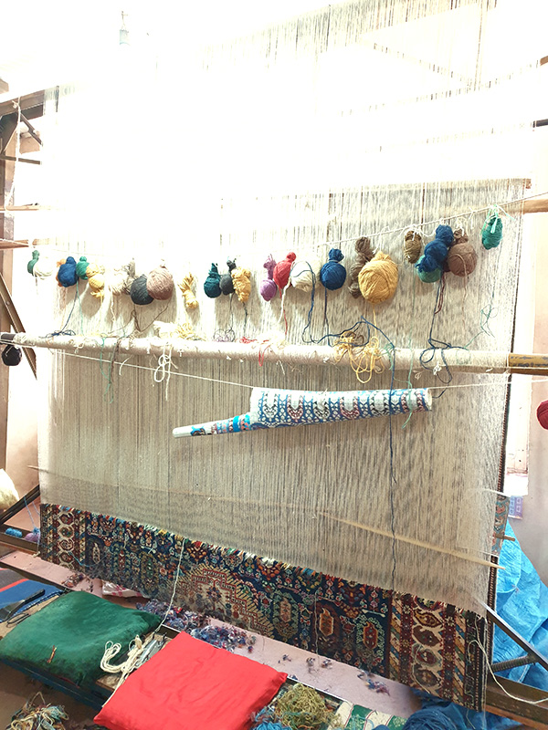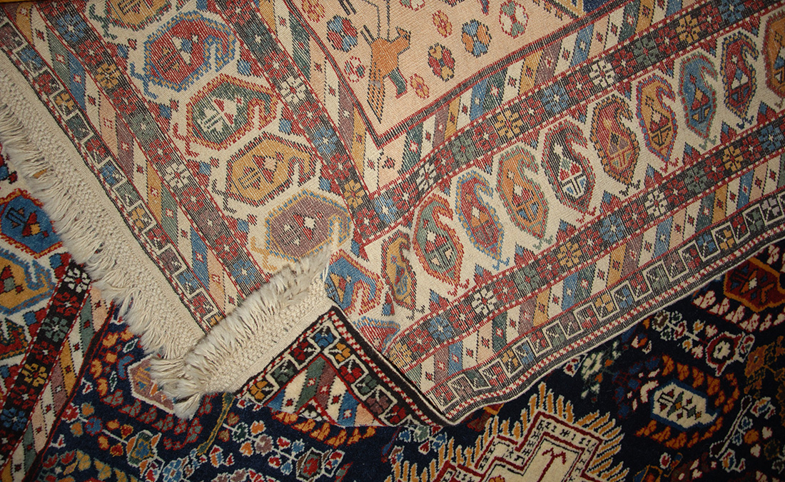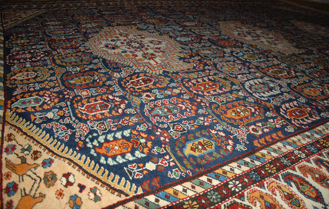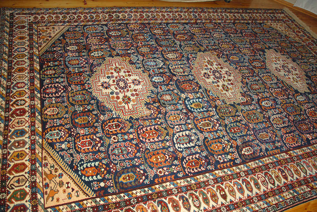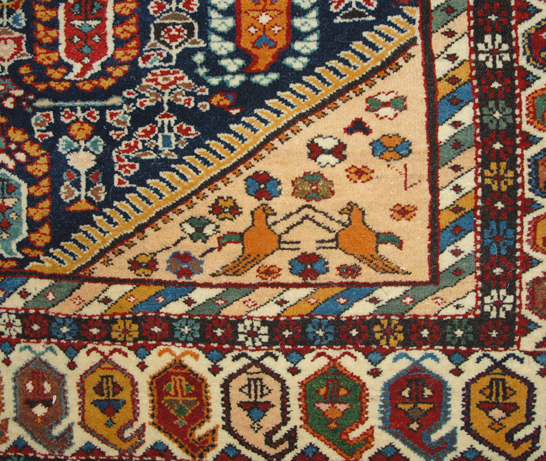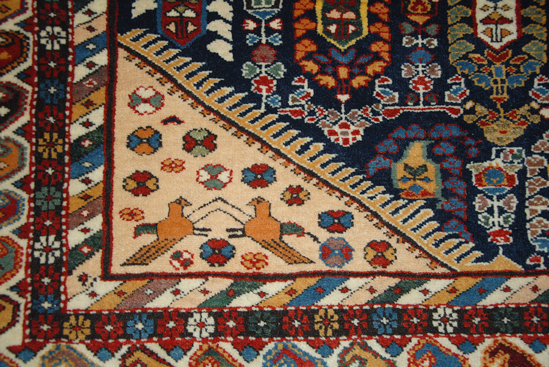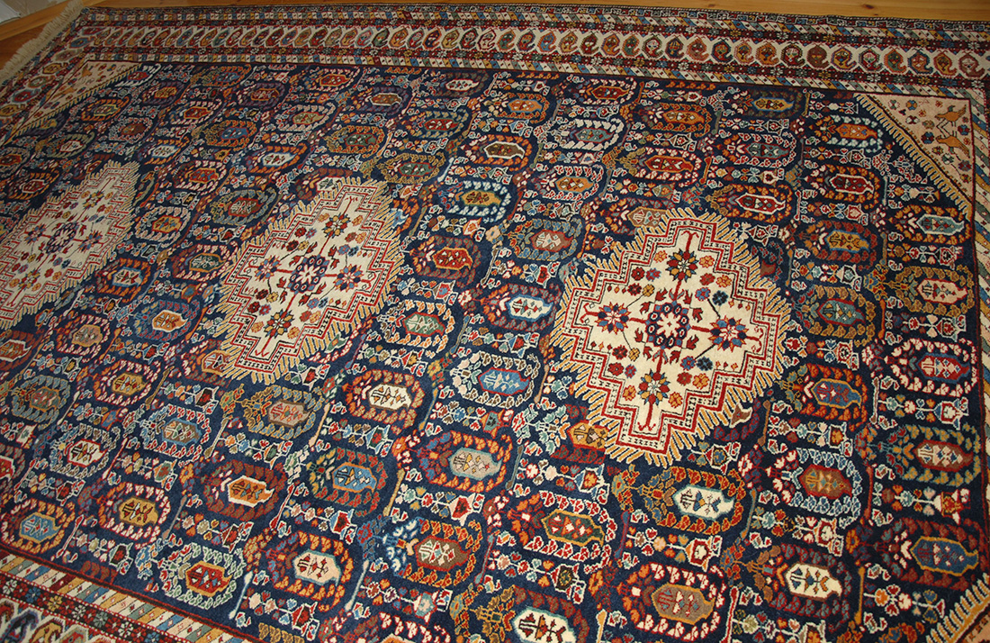 rug Code: BKXB03 Size: 224x338cm Size (ft): 7'4"x11'1" Area: 7.57 m2 Density: 170 000 knots per square meter, totally ~1 200 000 knots Colors: midnight blue, medium blue, cinnamon, apricot, purple, medium light blue, red, yellow, green, maroon, dark green, light green, hazelnut, aubergine, dark brown, dark goldenrod, medium brown, ivory. Dyes: madder, weld (Reseda Luteola), onion skins, indigo, pomegranate skins, walnut husks, natural dark brown sheep wool, natural ivory sheep wool. Materials: Handcarded and handspun wool for pile, ivory wool warps and ivory wool wefts (two shots). 1cm of flatwoven kilim ends at both sides. - wool on wool Knots: Gördes (Turkish, symmetrical) Pile height: 0.4cm Ends: five rows of decorative knotted meshwork Inscriptions: tamga (tribal seal) of Afshar tribe ![]() Weavers: Kamila, Könül, Shahla, Arzu Weaving Period: 5 months Handwoven in Baku, Azerbaijan Design: A fine Baku Khila kelleh - the midnight blue field with diagonal rows of large polychrome double floral boteh motif (situated within each other - "pregnant boteh") divided by small floral elements around three stepped medallions, each with various stylised floral motifs, in an ivory main border of polychrome boteh motif between diagonal striped "Pakhlava" (Traditional Azeri layered pastry with walnut filling), flower meander and flower head motif minor borders and outer barber-pole stripes. |