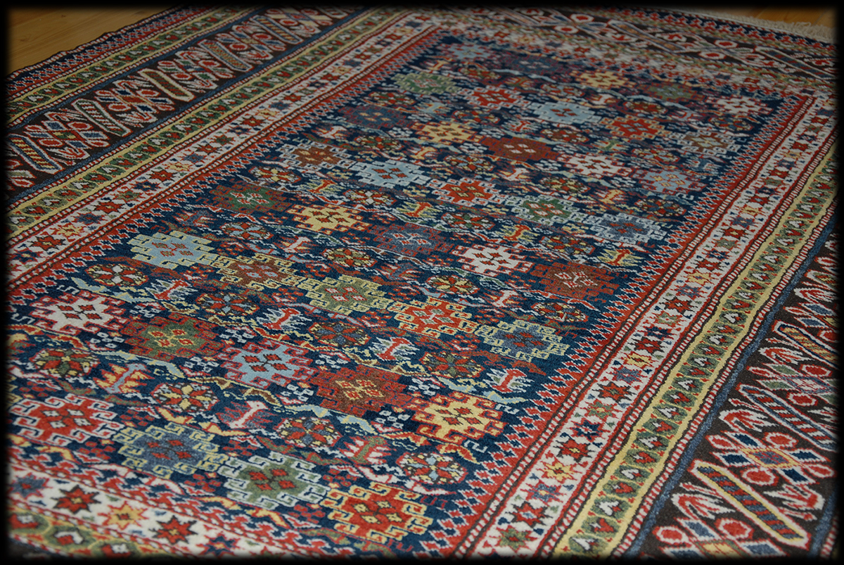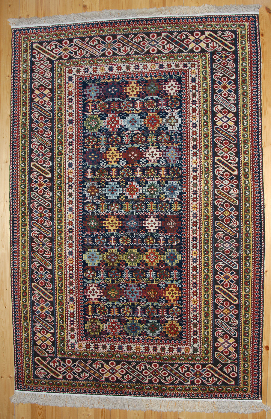Chi-Chi rug CODE: KUCHI16 Size (metric): 133x201cm Size (ft): 4'4"x6'7" Area: 2.67 m2 Density: 195 000 knots per square meter, totally ~500 000 knots Weaving period: 3 months Dyes: 100% natural dyes: madder, weld (Reseda Luteola), indigo, pomegranate skins, walnut husks, natural brown sheep wool, natural ivory sheep wool - all are eco-friendly and non-toxic Colors (9): light blue, madder red, obergine, dark blue, variegated green, yellow, medium blue (Persian blue), natural ivory, natural brown. Materials: Handcarded and handspun wool for pile, dark grey wool warps and cotton wefts Handwoven in Azerbaijan Design: The shaded navy blue field with overall diagonal rows of stylised polychrome archaic "Memling" Guls (totally 63 boxes) together with floral octagons, jewelry motifs, hooked bars, hooked and chequered guls, inner reciprocal skittle-pattern stripe, in brown border of open polychrome rosettes and chequered buttons between floral meander, linked rosette lozenge and reciprocal skittle-pattern stripe, outer barber-pole stripes, short kilim at each end |