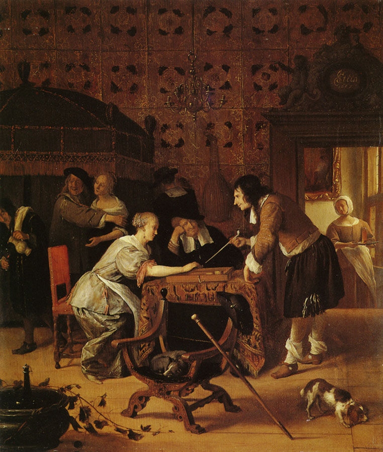 "A Game of Backgammon", 1667, by Jan Steen (1626–1679), 45.5 × 39 cm, oil on panel, Hermitage, St. Petersburg