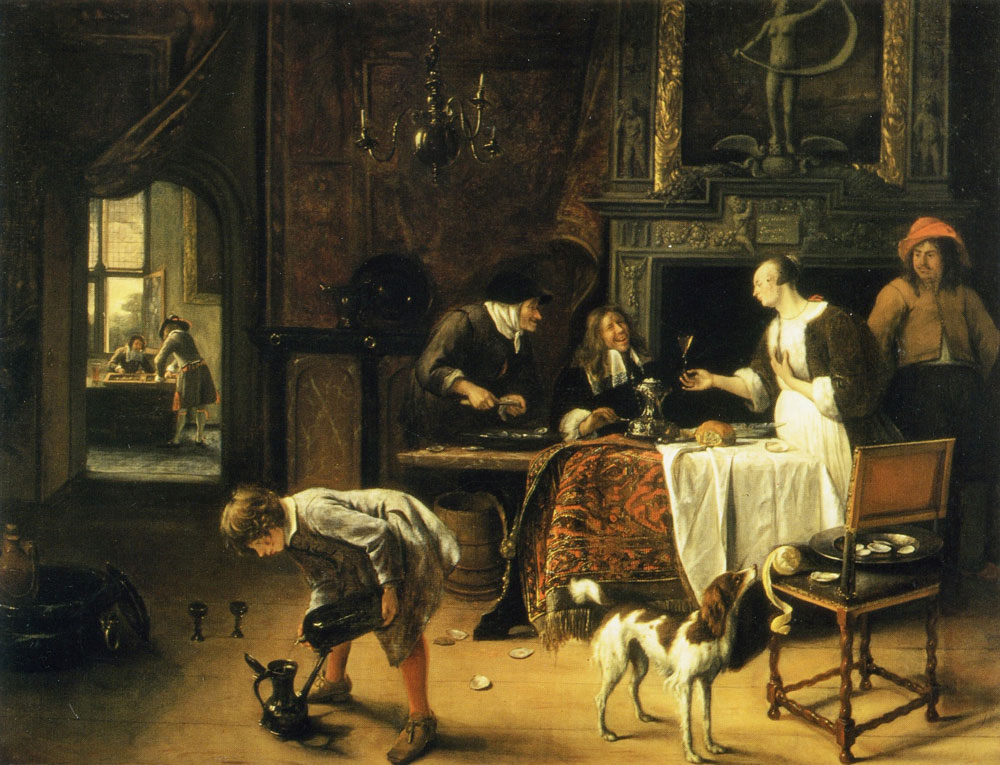 "Easy Come, Easy Go" (1661) by Jan Steen (1626–1679). Oil on canvas, 79 × 104 cm. Museum Boijmans Van Beuningen, Rotterdam.