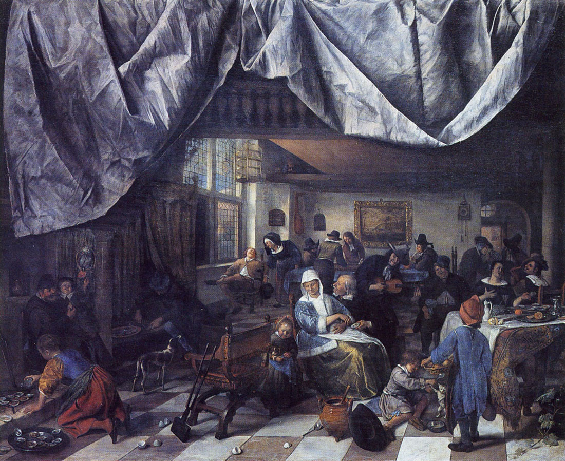 "The Life of Man", c. 1674, by Jan Steen (1626–1679), 68.2 × 82 cm, oil on canvas, Mauritshuis, The Hague